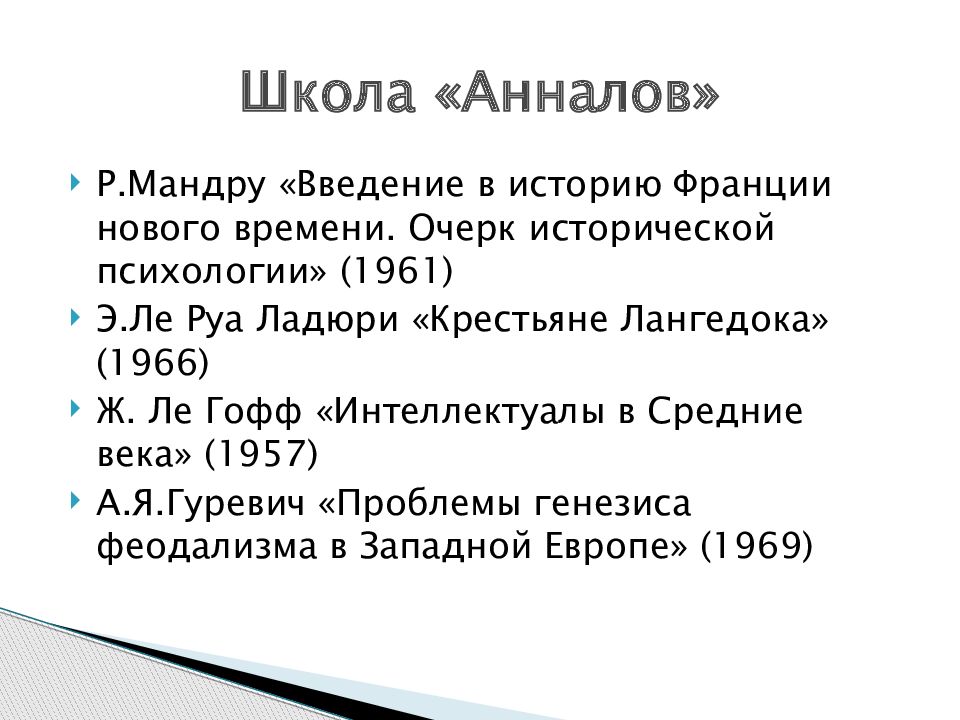 Р.Мандру «Введение в историю Франции нового времени. Очерк исторической психологии» (1961) Э.Ле Руа Ладюри «Крестьяне Лангедока» (1966) Ж. Ле Гофф «Интеллектуалы в Средние века» (1957) А.Я.Гуревич «Проблемы генезиса феодализма в Западной Европе» (1969) Школа «Анналов»