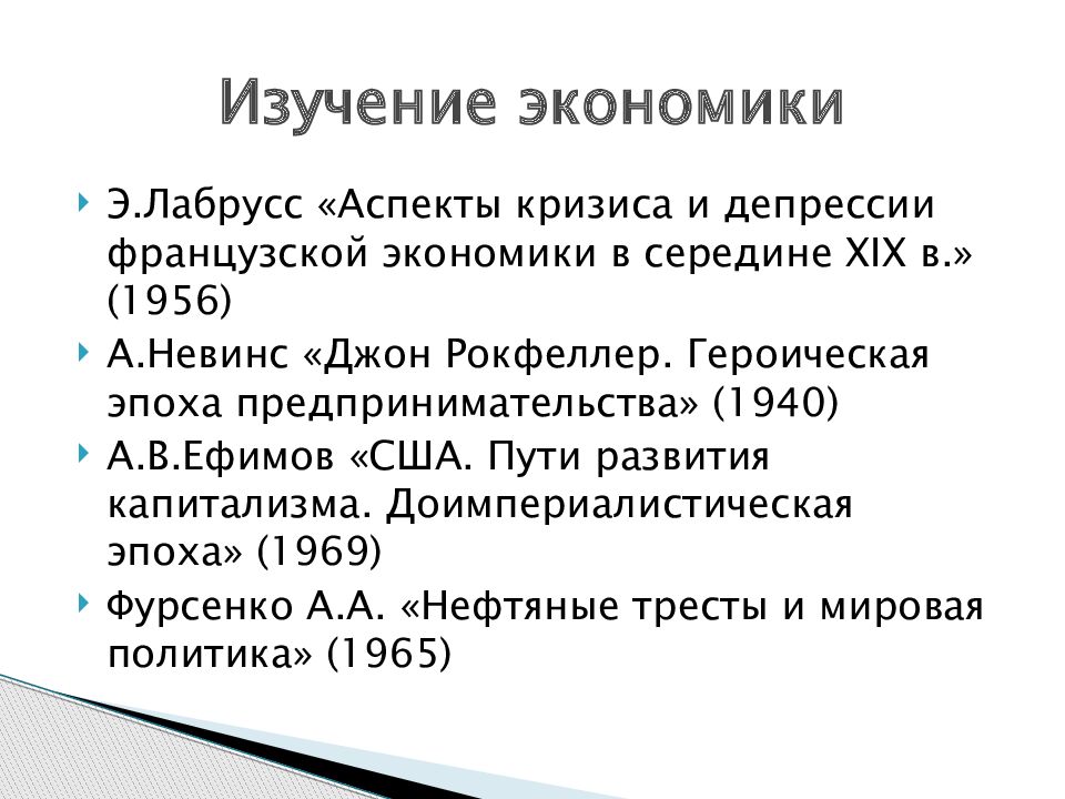 Э.Лабрусс «Аспекты кризиса и депрессии французской экономики в середине XIX в.» (1956) А.Невинс «Джон Рокфеллер. Героическая эпоха предпринимательства» (1940) А.В.Ефимов «США. Пути развития капитализма. Доимпериалистическая эпоха» (1969) Фурсенко А.А. «Нефтяные тресты и мировая политика» (1965) Изучение экономики