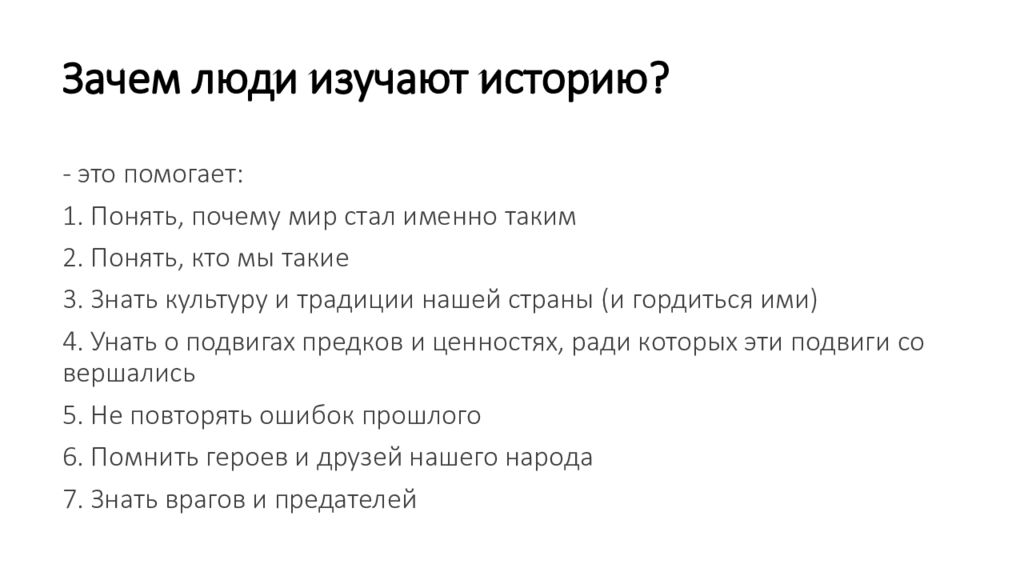 - это помогает : 1. Понять, почему мир стал именно таким 2. Понять, кто мы такие 3. Знать культуру и традиции нашей страны ( и гордиться ими ) 4. Унать о подвигах предков и ценностях, ради которых эти подвиги совершались 5. Не повторять ошибок прошлого 6. Помнить героев и друзей нашего народа 7. Знать врагов и предателей