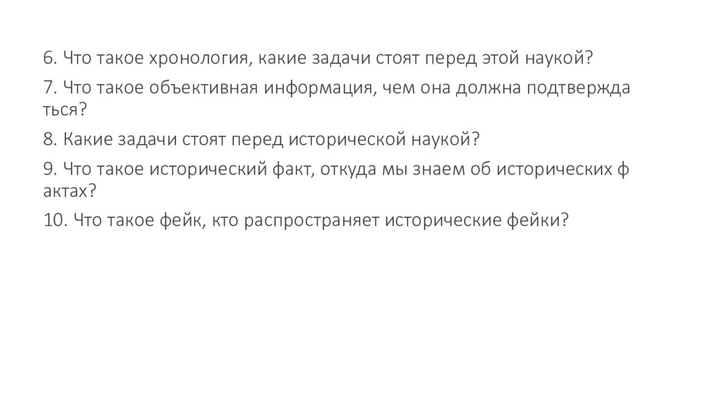 6. Что такое хронология, какие задачи стоят перед этой наукой ? 7. Что такое объективная информация, чем она должна подтверждаться ? 8. Какие задачи стоят перед исторической наукой ? 9. Что такое исторический факт, откуда мы знаем об исторических фактах ? 10. Что такое фейк, кто распространяет исторические фейки ?