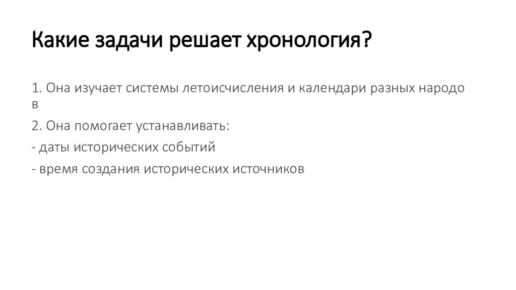 1. Она изучает системы летоисчисления и календари разных народов 2. Она помогает устанавливать : - даты исторических событий - время создания исторических источников