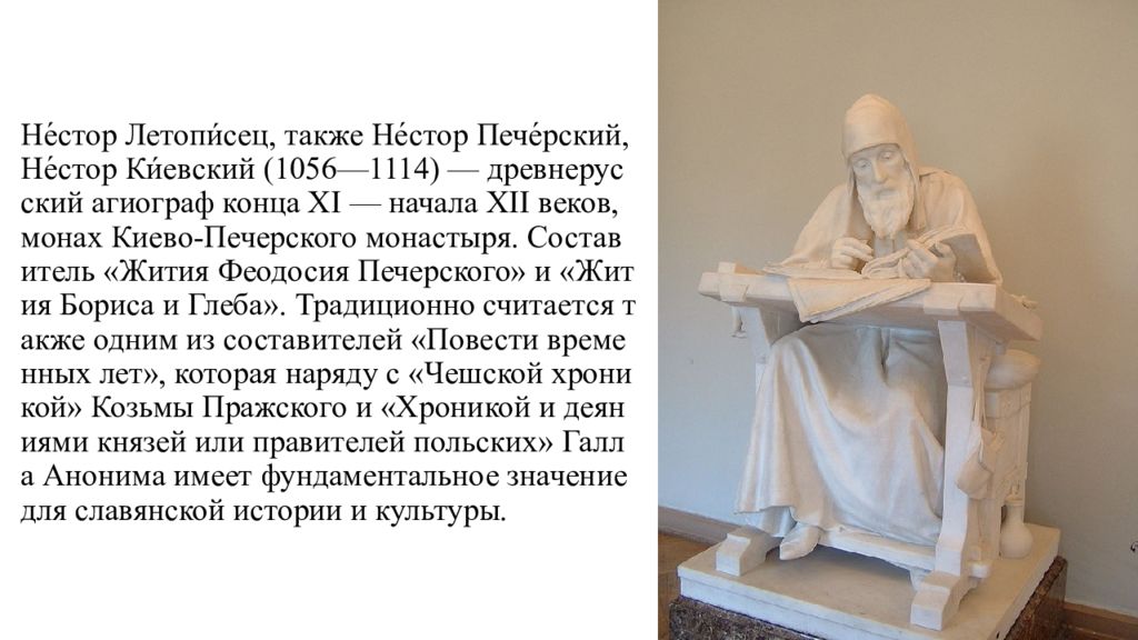 Слайд 7: Не́стор Летопи́сец, также Не́стор Пече́рский, Не́стор Ки́евский (1056—1114) — древнерусский агиограф конца XI — начала XII веков, монах Киево - Печерского монастыря. Составитель « Жития Феодосия Печерского » и « Жития Бориса и Глеба ». Традиционно считается также одним из составителей « Повести временных лет », которая наряду с « Чешской хроникой » Козьмы Пражского и « Хроникой и деяниями князей или правителей польских » Галла Анонима имеет фундаментальное значение для славянской истории и культуры