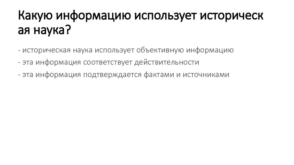 - историческая наука использует объективную информацию - эта информация соответствует действительности - эта информация подтверждается фактами и источниками
