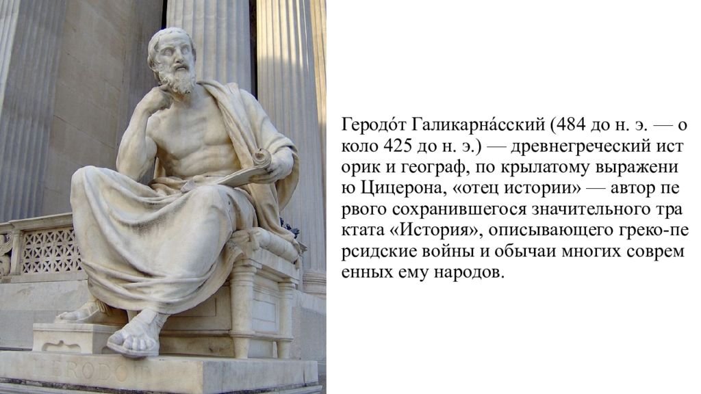 Слайд 5: Геродо́т Галикарна́сский (484 до н. э. — около 425 до н. э.) — древнегреческий историк и географ, по крылатому выражению Цицерона, « отец истории » — автор первого сохранившегося значительного трактата « История », описывающего греко - персидские войны и обычаи многих современных ему народов
