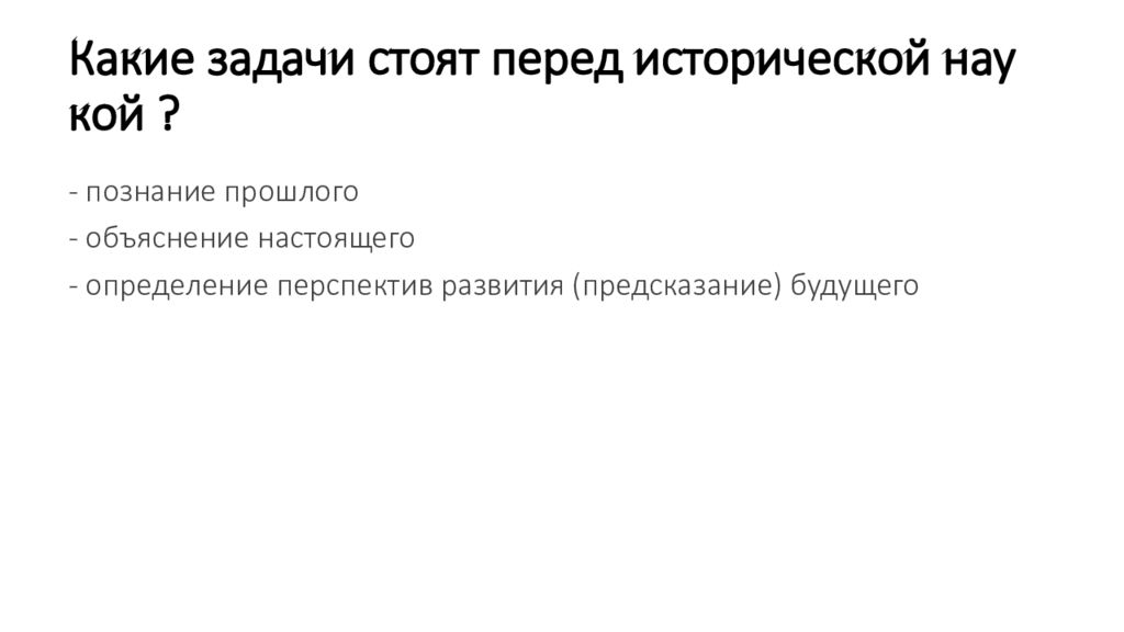 - познание прошлого - объяснение настоящего - определение перспектив развития ( предсказание ) будущего