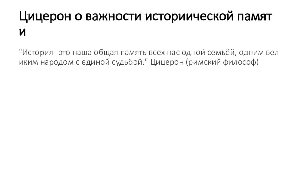 " История - это наша общая память всех нас одной семьёй, одним великим народом с единой судьбой." Цицерон ( римский философ )