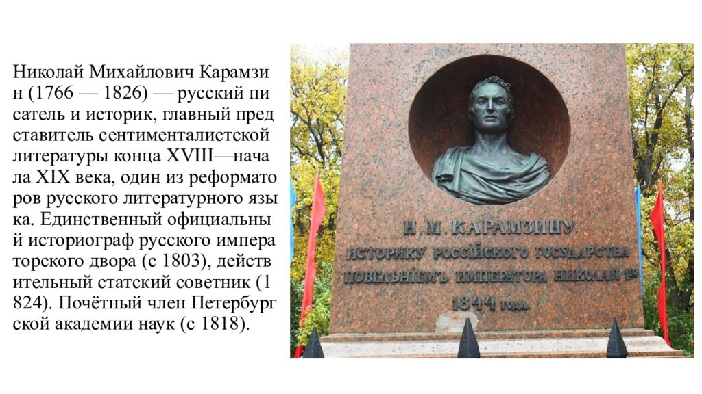 Слайд 11: Николай Михайлович Карамзин (1766 — 1826) — русский писатель и историк, главный представитель сентименталистской литературы конца XVIII— начала XIX века, один из реформаторов русского литературного языка. Единственный официальный историограф русского императорского двора ( с 1803), действительный статский советник (1824). Почётный член Петербургской академии наук ( с 1818)