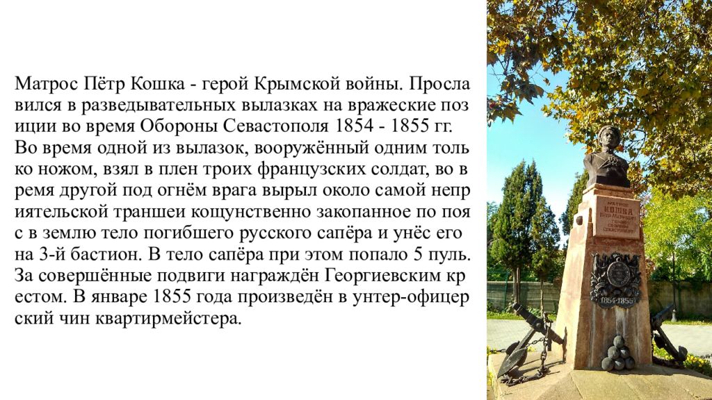 Слайд 13: Матрос Пётр Кошка - герой Крымской войны. Прославился в разведывательных вылазках на вражеские позиции во время Обороны Севастополя 1854 - 1855 гг. Во время одной из вылазок, вооружённый одним только ножом, взял в плен троих французских солдат, во время другой под огнём врага вырыл около самой неприятельской траншеи кощунственно закопанное по пояс в землю тело погибшего русского сапёра и унёс его на 3- й бастион. В тело сапёра при этом попало 5 пуль. За совершённые подвиги награждён Георгиевским крестом. В январе 1855 года произведён в унтер - офицерский чин квартирмейстера