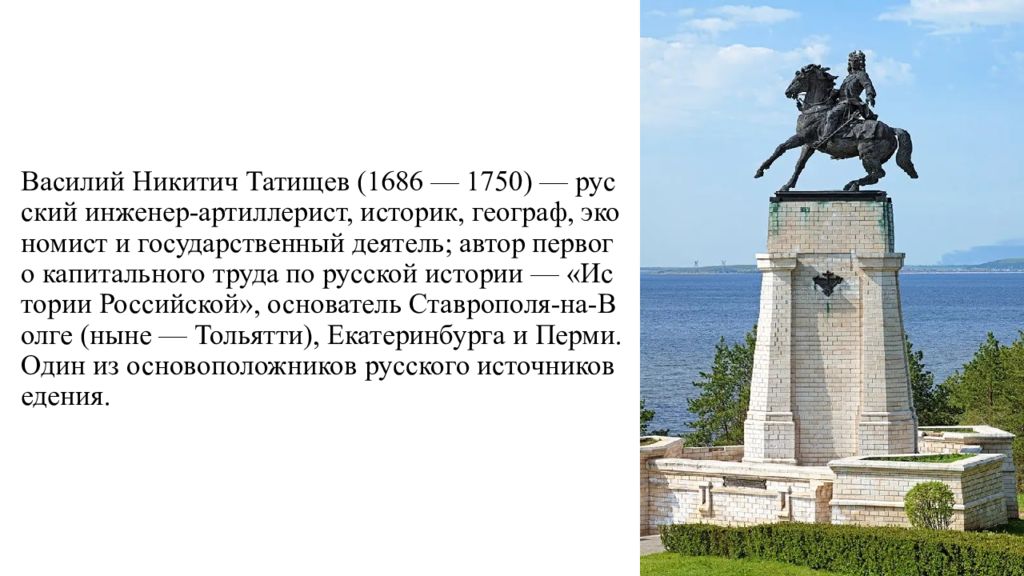 Слайд 9: Василий Никитич Татищев (1686 — 1750) — русский инженер - артиллерист, историк, географ, экономист и государственный деятель ; автор первого капитального труда по русской истории — « Истории Российской », основатель Ставрополя - на - Волге ( ныне — Тольятти ), Екатеринбурга и Перми. Один из основоположников русского источниковедения