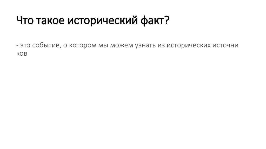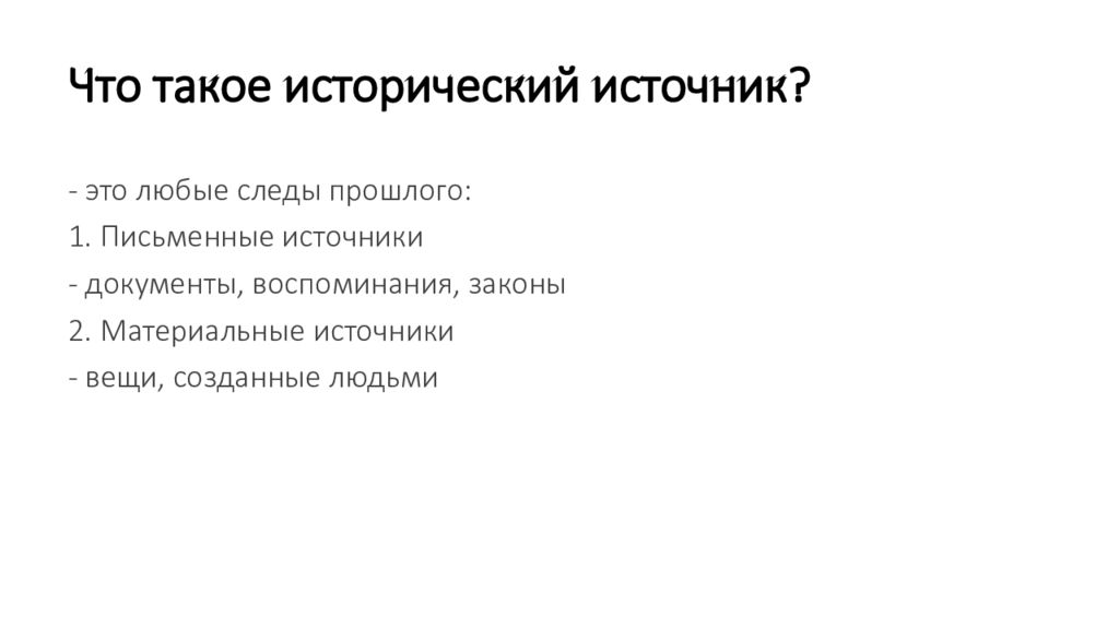 - это любые следы прошлого : 1. Письменные источники - документы, воспоминания, законы 2. Материальные источники - вещи, созданные людьми