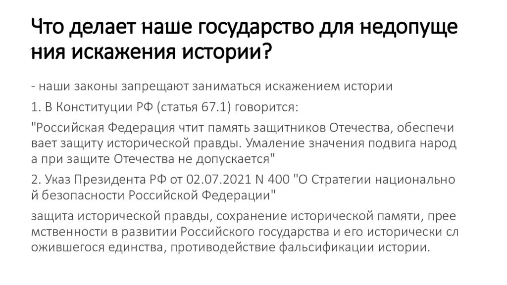 - наши законы запрещают заниматься искажением истории 1. В Конституции РФ ( статья 67.1) говорится : " Российская Федерация чтит память защитников Отечества, обеспечивает защиту исторической правды. Умаление значения подвига народа при защите Отечества не допускается " 2. Указ Президента РФ от 02.07.2021 N 400 " О Стратегии национальной безопасности Российской Федерации " защита исторической правды, сохранение исторической памяти, преемственности в развитии Российского государства и его исторически сложившегося единства, противодействие фальсификации истории.