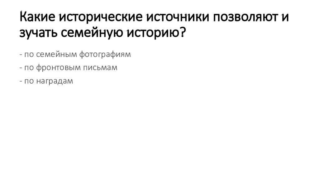 - по семейным фотографиям - по фронтовым письмам - по наградам