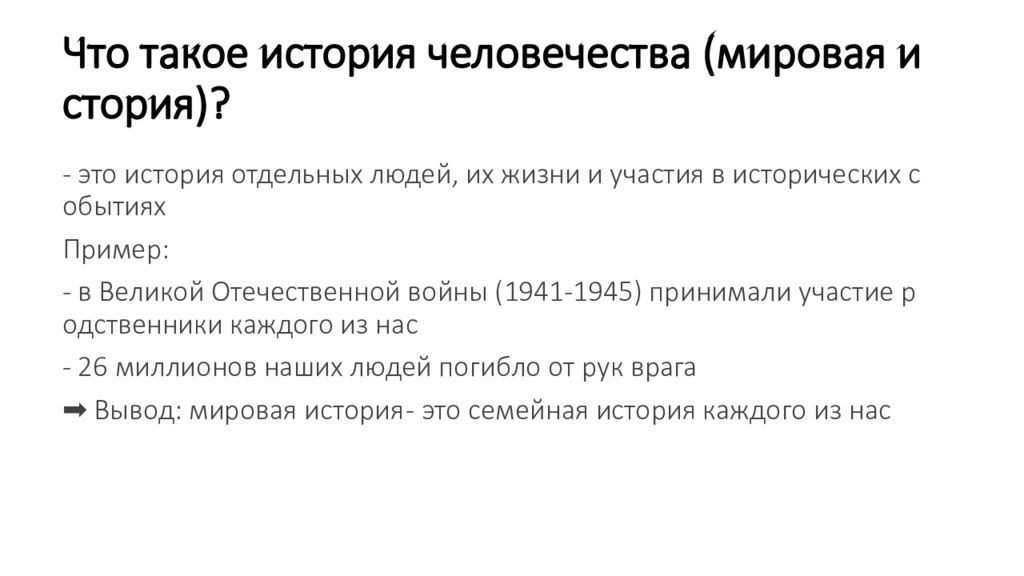 - это история отдельных людей, их жизни и участия в исторических событиях Пример : - в Великой Отечественной войны (1941-1945) принимали участие родственники каждого из нас - 26 миллионов наших людей погибло от рук врага ➡ ️ Вывод : мировая история - это семейная история каждого из нас