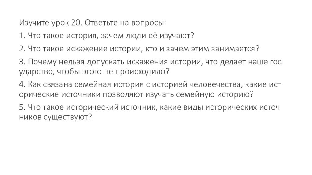 Изучите урок 20. Ответьте на вопросы : 1. Что такое история, зачем люди её изучают ? 2. Что такое искажение истории, кто и зачем этим занимается ? 3. Почему нельзя допускать искажения истории, что делает наше государство, чтобы этого не происходило ? 4. Как связана семейная история с историей человечества, какие исторические источники позволяют изучать семейную историю ? 5. Что такое исторический источник, какие виды исторических источников существуют ?