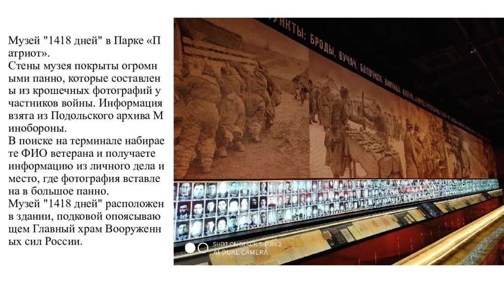 Слайд 25: Музе й "1418 дней " в Парке «Патриот». Стены музея покрыты огромными панно, которые составлены из крошечных фотографий участников войны. Информация взята из Подольского архива Минобороны. В поиске на терминале набираете ФИО ветерана и получаете информацию из личного дела и место, где фотография вставлена в большое панно. Музей "1418 дней " расположен в здании, подковой опоясывающем Главный храм Вооруженных сил России