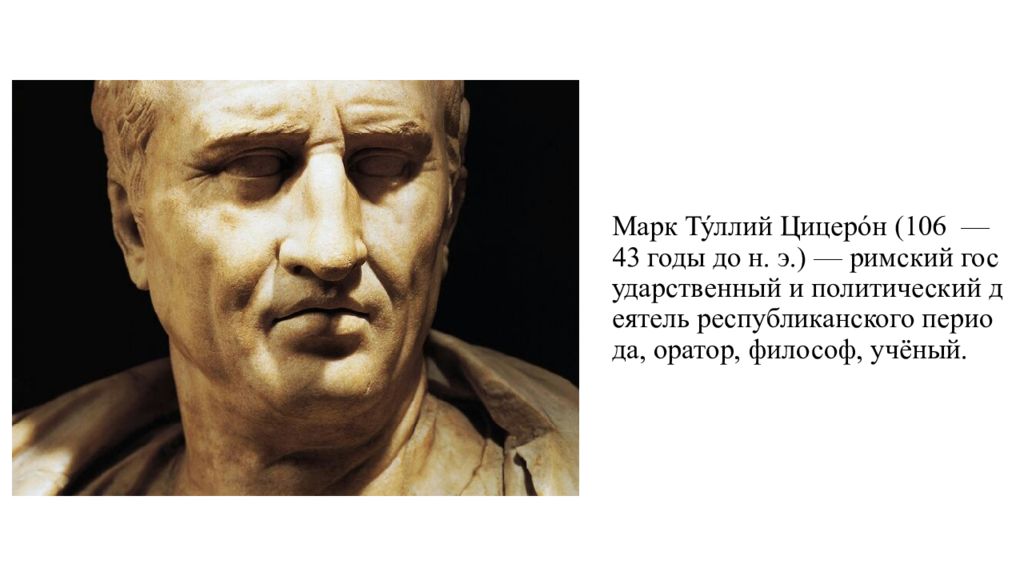 Слайд 30: Марк Ту́ллий Цицеро́н (106 — 43 год ы до н. э.) — римский государственный и политический деятель республиканского периода, оратор, философ, учёный
