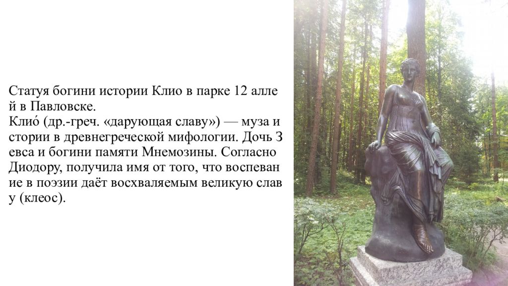 Слайд 3: Статуя богини истории Клио в парке 12 аллей в Павловске. Клио́ ( др.- греч. « дарующая славу » ) — муза истории в древнегреческой мифологии. Дочь Зевса и богини памяти Мнемозины. Согласно Диодору, получила имя от того, что воспевание в поэзии даёт восхваляемым великую славу ( клеос )