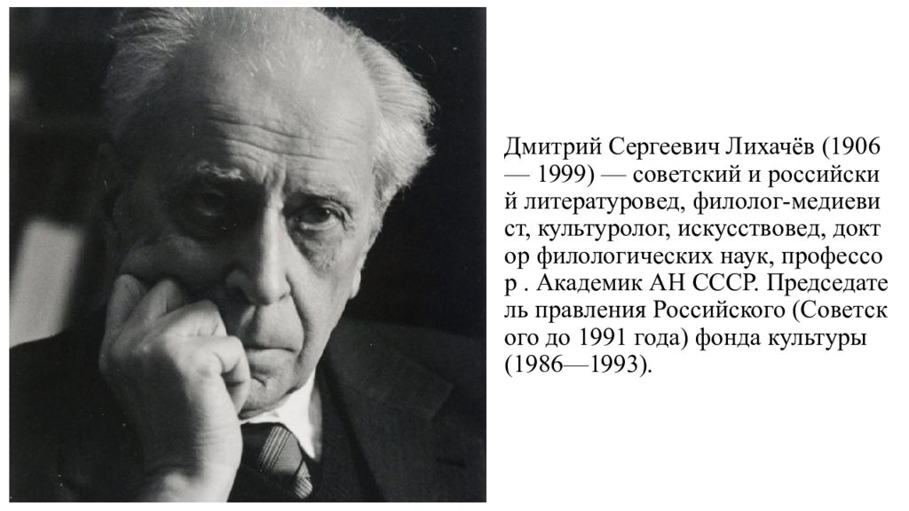 Слайд 23: Дмитрий Сергеевич Лихачёв (1906 — 1999) — советский и российский литературовед, филолог - медиевист, культуролог, искусствовед, доктор филологических наук, профессор. Академик АН СССР. Председатель правления Российского ( Советского до 1991 года ) фонда культуры (1986—1993)