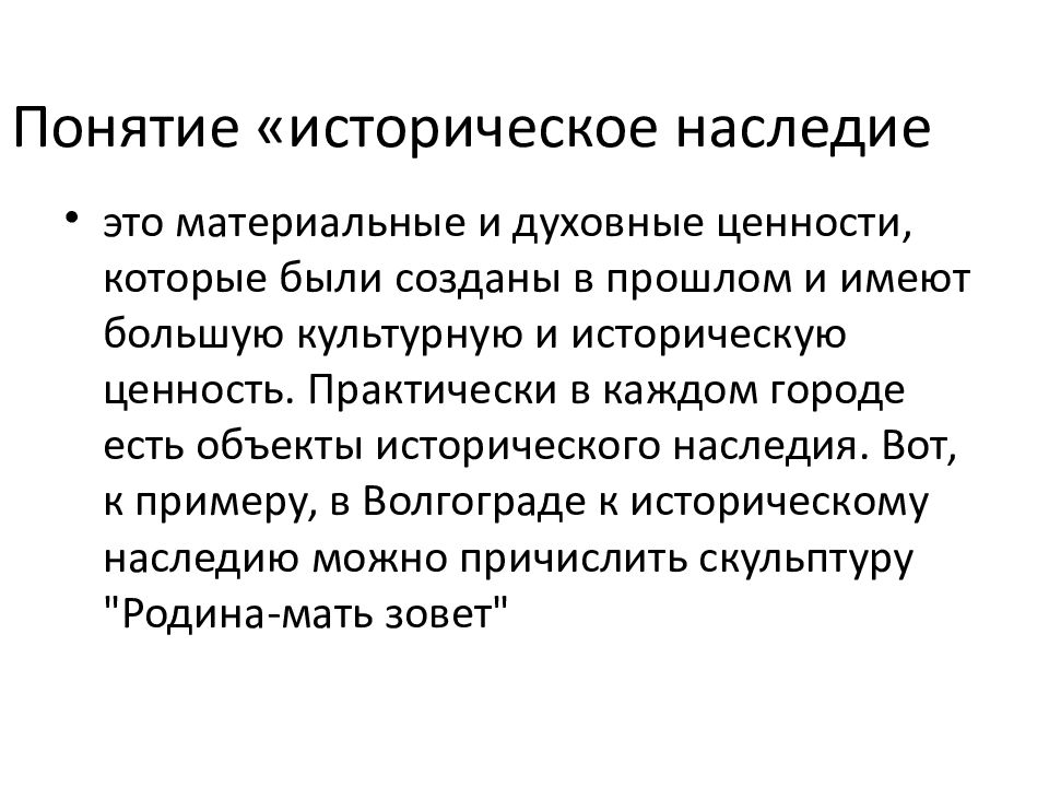 это материальные и духовные ценности, которые были созданы в прошлом и имеют большую культурную и историческую ценность. Практически в каждом городе есть объекты исторического наследия. Вот, к примеру, в Волгограде к историческому наследию можно причислить скульптуру "Родина-мать зовет"