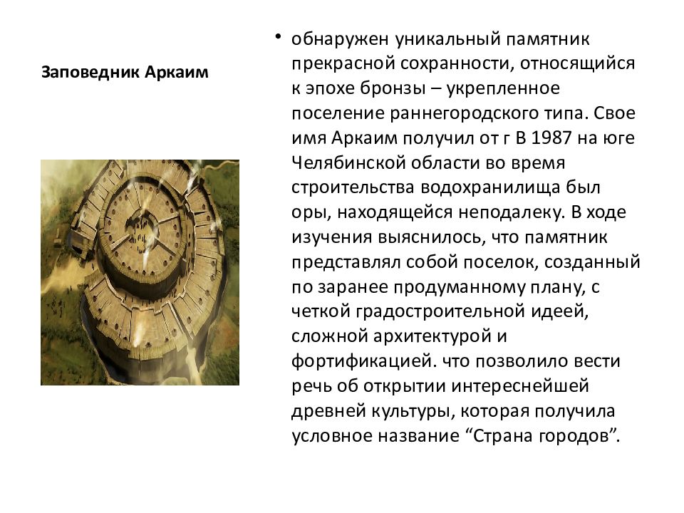 обнаружен уникальный памятник прекрасной сохранности, относящийся к эпохе бронзы – укрепленное поселение раннегородского типа. Свое имя Аркаим получил от г В 1987 на юге Челябинской области во время строительства водохранилища был оры, находящейся неподалеку. В ходе изучения выяснилось, что памятник представлял собой поселок, созданный по заранее продуманному плану, с четкой градостроительной идеей, сложной архитектурой и фортификацией. что позволило вести речь об открытии интереснейшей древней культуры, которая получила условное название “Страна городов”.