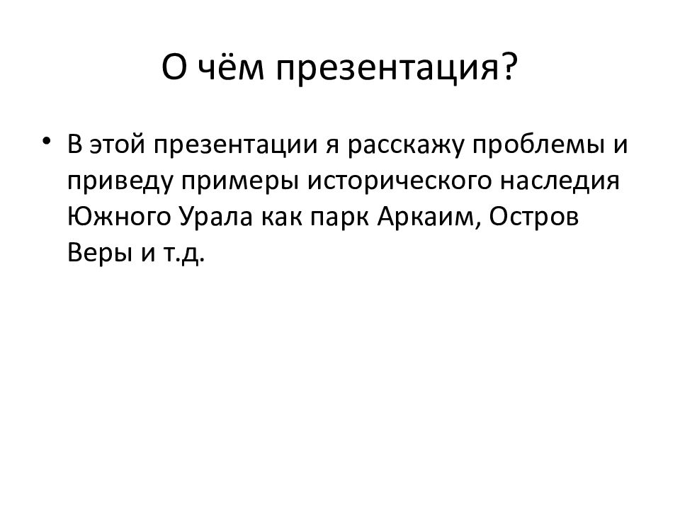 В этой презентации я расскажу проблемы и приведу примеры исторического наследия Южного Урала как парк Аркаим, Остров Веры и т.д.