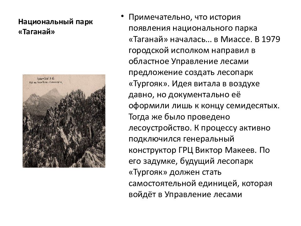 Примечательно, что история появления национального парка « Таганай » началась… в Миассе. В 1979 городской исполком направил в областное Управление лесами предложение создать лесопарк «Тургояк». Идея витала в воздухе давно, но документально её оформили лишь к концу семидесятых. Тогда же было проведено лесоустройство. К процессу активно подключился генеральный конструктор ГРЦ Виктор Макеев. По его задумке, будущий лесопарк «Тургояк» должен стать самостоятельной единицей, которая войдёт в Управление лесами