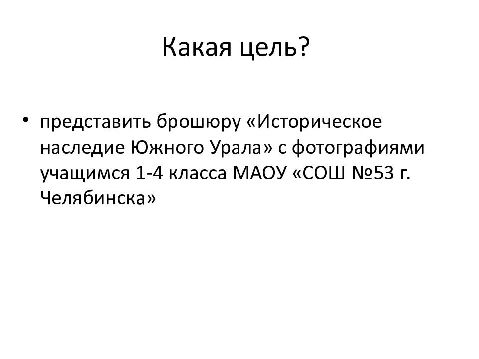 представить брошюру «Историческое наследие Южного Урала» с фотографиями учащимся 1-4 класса МАОУ «СОШ №53 г. Челябинска»