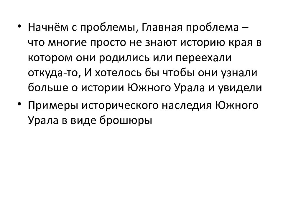 Начнём с проблемы, Главная проблема – что многие просто не знают историю края в котором они родились или переехали откуда-то, И хотелось бы чтобы они узнали больше о истории Южного Урала и увидели Примеры исторического наследия Южного Урала в виде брошюры