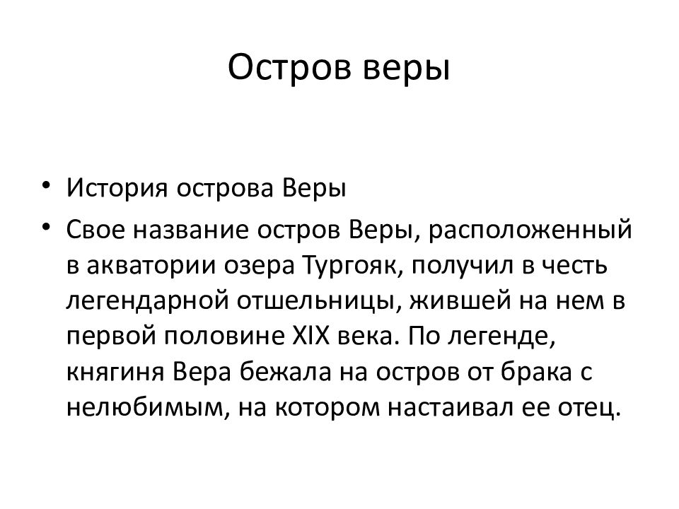 История острова Веры Свое название остров Веры, расположенный в акватории озера Тургояк, получил в честь легендарной отшельницы, жившей на нем в первой половине XIX века. По легенде, княгиня Вера бежала на остров от брака с нелюбимым, на котором настаивал ее отец.