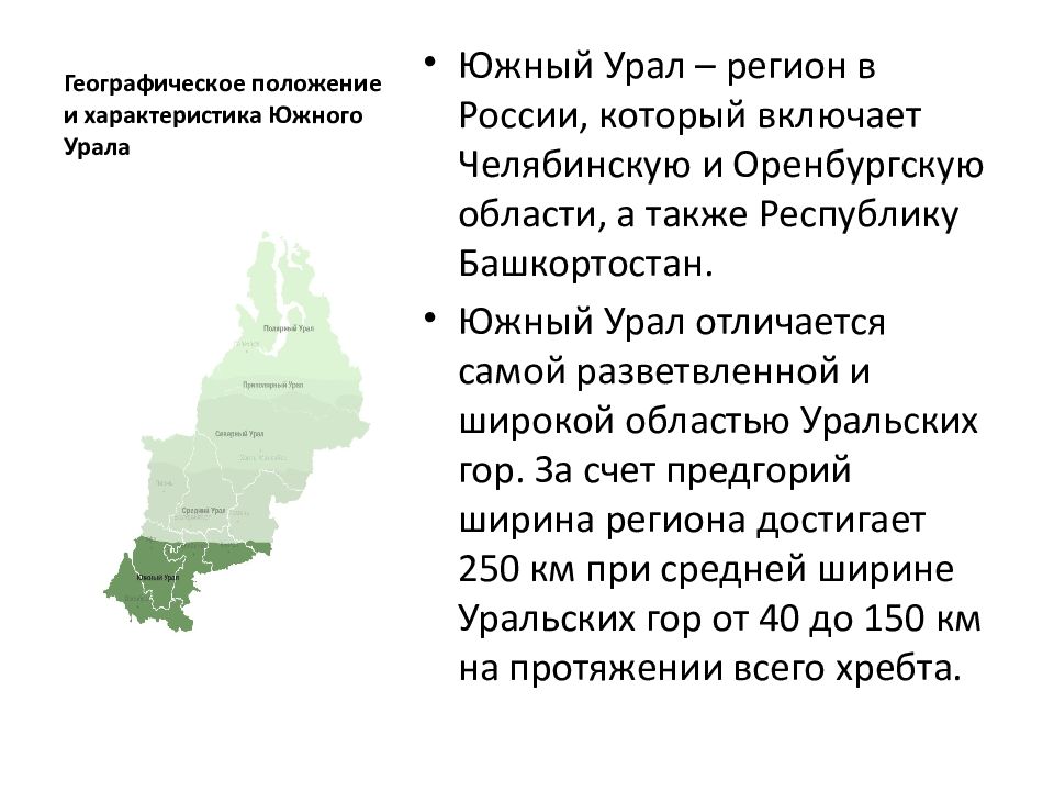 Южный Урал – регион в России, который включает Челябинскую и Оренбургскую области, а также Республику Башкортостан. Южный Урал отличается самой разветвленной и широкой областью Уральских гор. За счет предгорий ширина региона достигает 250 км при средней ширине Уральских гор от 40 до 150 км на протяжении всего хребта.