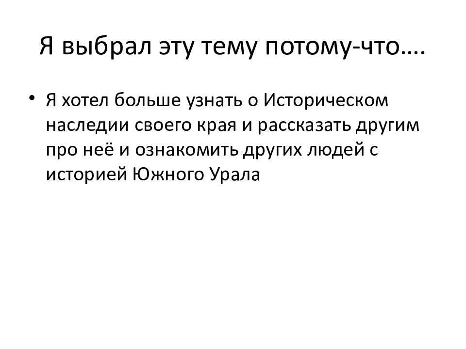 Я хотел больше узнать о Историческом наследии своего края и рассказать другим про неё и ознакомить других людей с историей Южного Урала