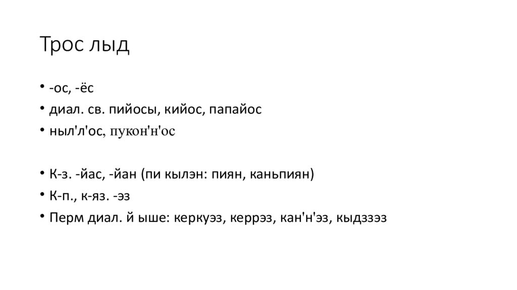 -ос, - ёс диал. св. пийосы, кийос, папайос ныл ' л ' ос, пукон'н'ос К-з. - йас, - йан (пи кылэн : пиян, каньпиян ) К-п., к-яз. - эз Перм диал. й ыше : керкуэз, керрэз, кан ' н ' эз, кыдззэз