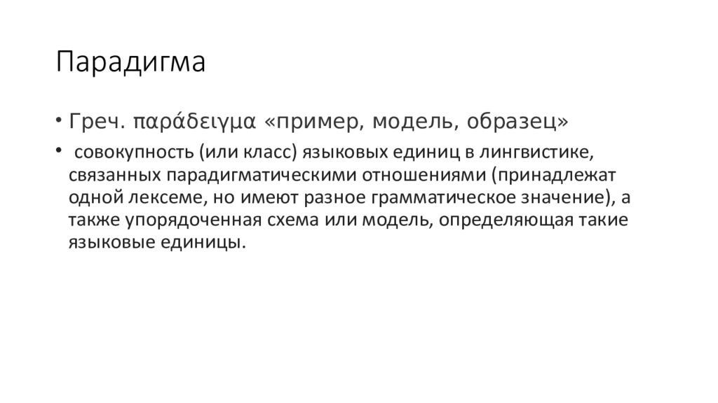 Греч. παράδειγμα «пример, модель, образец» совокупность (или класс) языковых единиц в лингвистике, связанных парадигматическими отношениями (принадлежат одной лексеме, но имеют разное грамматическое значение), а также упорядоченная схема или модель, определяющая такие языковые единицы.