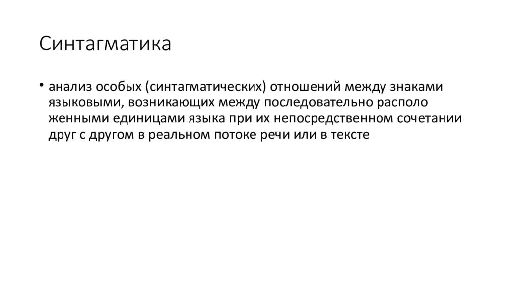 анализ особых (синтагматических) отношений между знаками языковыми, возникающих между последовательно расположенными единицами языка при их непосредственном сочетании друг с другом в реальном потоке речи или в тексте