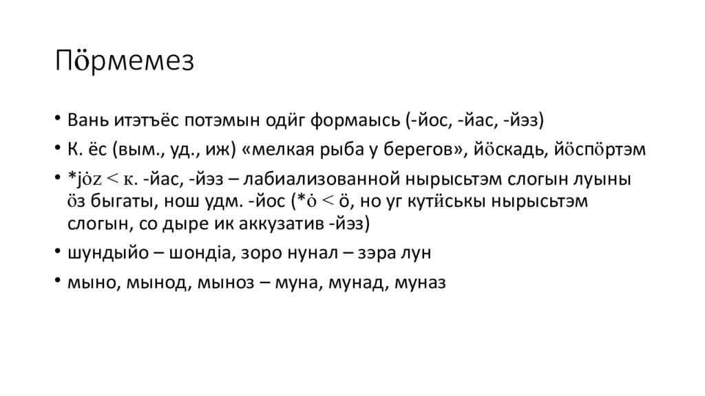 Вань итэтъёс потэмын од ӥг формаысь (- йос, - йас, - йэз ) К. ёс ( вым., уд., иж ) «мелкая рыба у берегов», й ӧ скадь, й ӧ сп ӧ ртэм * j ȯz < к. - йас, - йэз – лабиализованной нырысьтэм слогын луыны ӧ з быгаты, нош удм. - йос (* ȯ < ӧ, но уг кут ӥ ськы нырысьтэм слогын, со дыре ик аккузатив - йэз ) шундыйо – шонд i а, зоро нунал – зэра лун мыно, мынод, мыноз – муна, мунад, муназ