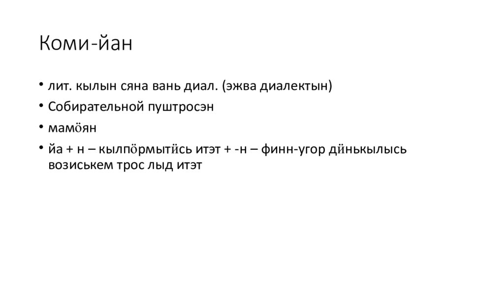 лит. кылын сяна вань диал. ( эжва диалектын ) Собирательной пуштросэн мам ӧ ян йа + н – кылп ӧ рмыт ӥ сь итэт + -н – финн-угор д ӥ нькылысь возиськем трос лыд итэт