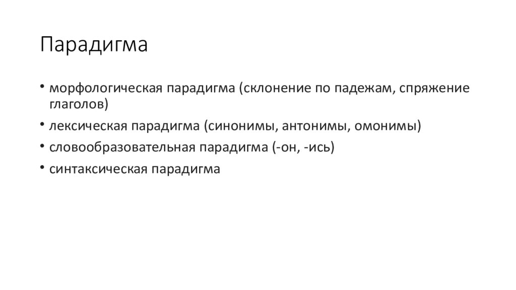 морфологическая парадигма (склонение по падежам, спряжение глаголов) лексическая парадигма (синонимы, антонимы, омонимы) словообразовательная парадигма (-он, - ись ) синтаксическая парадигма