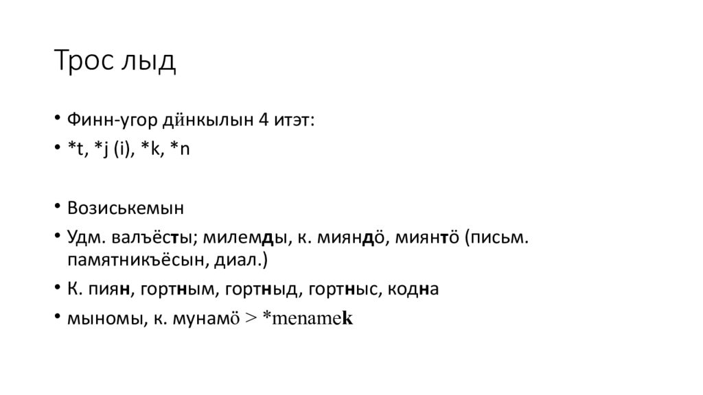 Финн-угор д ӥ нкылын 4 итэт : * t, *j (i), *k, *n Возиськемын Удм. валъёс т ы ; милем д ы, к. миян д ӧ, миян т ӧ (письм. памятникъёсын, диал.) К. пия н, горт н ым, горт н ыд, горт н ыс, код н а мыномы, к. мунам ӧ > * mename k