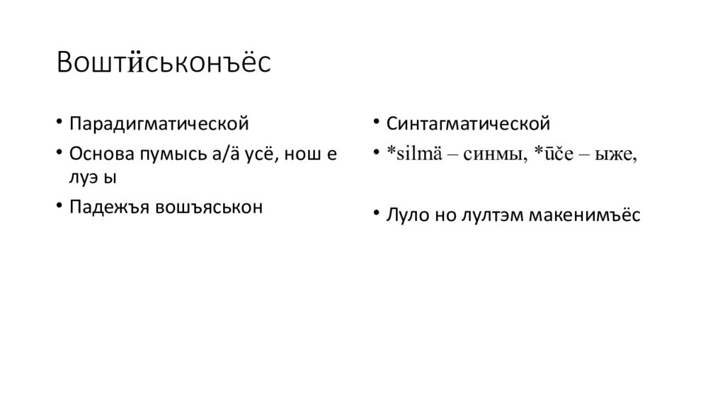 Парадигматической Основа пумысь а /ä усё, нош e луэ ы Падежъя вошъяськон Синтагматической *silmä – синмы, *ūče – ыже, Луло но лултэм макенимъёс