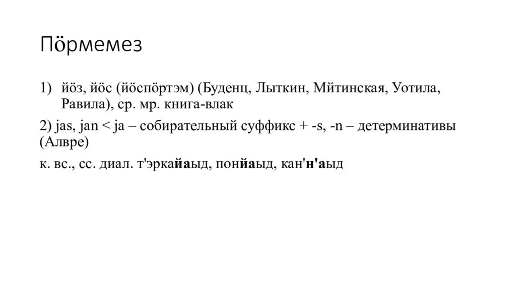 йӧз, йӧс ( йӧспӧртэм ) ( Буденц, Лыткин, Мйтинская, Уотила, Равила ), ср. мр. книга- влак 2) jas, jan < ja – собирательный суффикс + - s, - n – детерминативы ( Алвре ) к. вс., сс. диал. т'эрка йа ыд, пон йа ыд, кан' н'а ыд