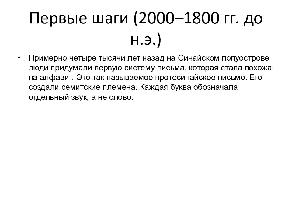 Примерно четыре тысячи лет назад на Синайском полуострове люди придумали первую систему письма, которая стала похожа на алфавит. Это так называемое протосинайское письмо. Его создали семитские племена. Каждая буква обозначала отдельный звук, а не слово.