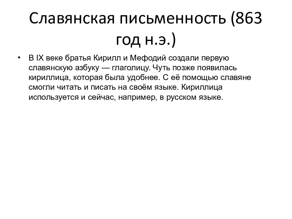 В IX веке братья Кирилл и Мефодий создали первую славянскую азбуку — глаголицу. Чуть позже появилась кириллица, которая была удобнее. С её помощью славяне смогли читать и писать на своём языке. Кириллица используется и сейчас, например, в русском языке.