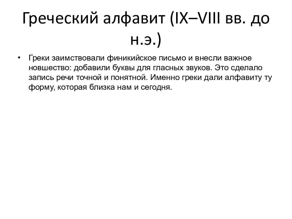 Греки заимствовали финикийское письмо и внесли важное новшество: добавили буквы для гласных звуков. Это сделало запись речи точной и понятной. Именно греки дали алфавиту ту форму, которая близка нам и сегодня.