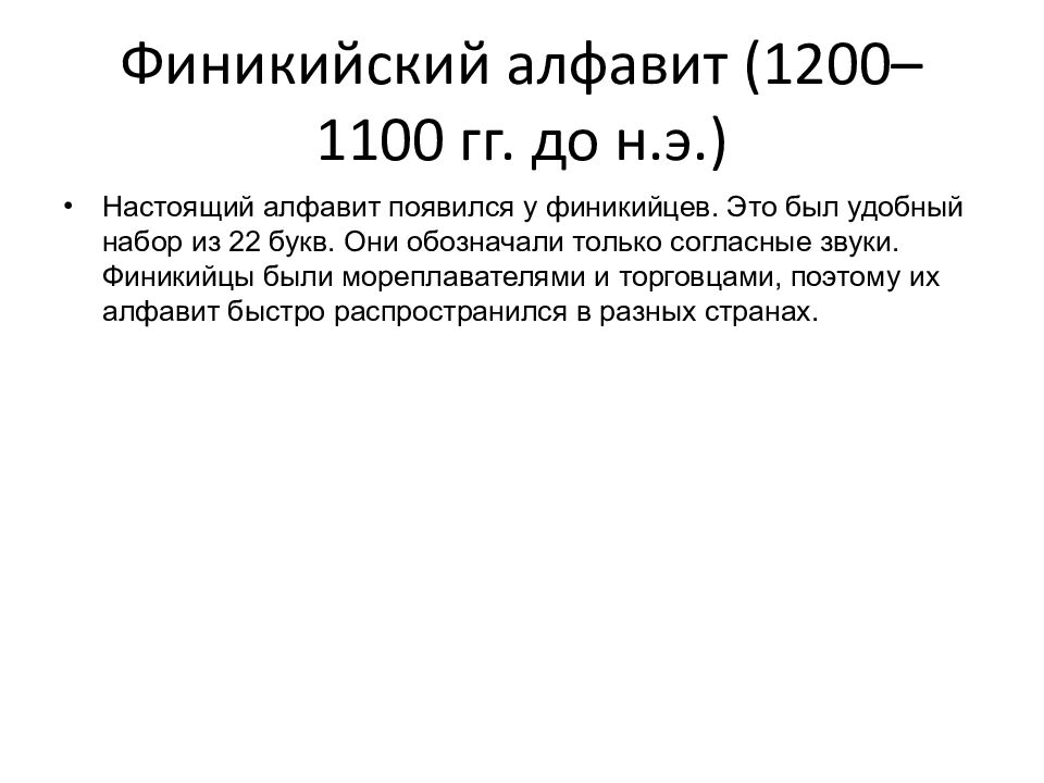 Настоящий алфавит появился у финикийцев. Это был удобный набор из 22 букв. Они обозначали только согласные звуки. Финикийцы были мореплавателями и торговцами, поэтому их алфавит быстро распространился в разных странах.