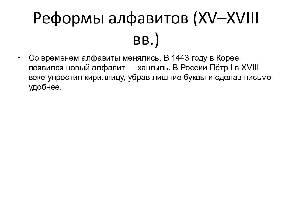 Со временем алфавиты менялись. В 1443 году в Корее появился новый алфавит — хангыль. В России Пётр I в XVIII веке упростил кириллицу, убрав лишние буквы и сделав письмо удобнее.