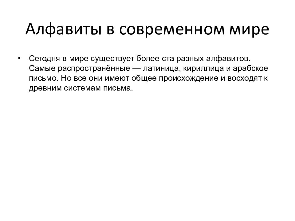 Сегодня в мире существует более ста разных алфавитов. Самые распространённые — латиница, кириллица и арабское письмо. Но все они имеют общее происхождение и восходят к древним системам письма.