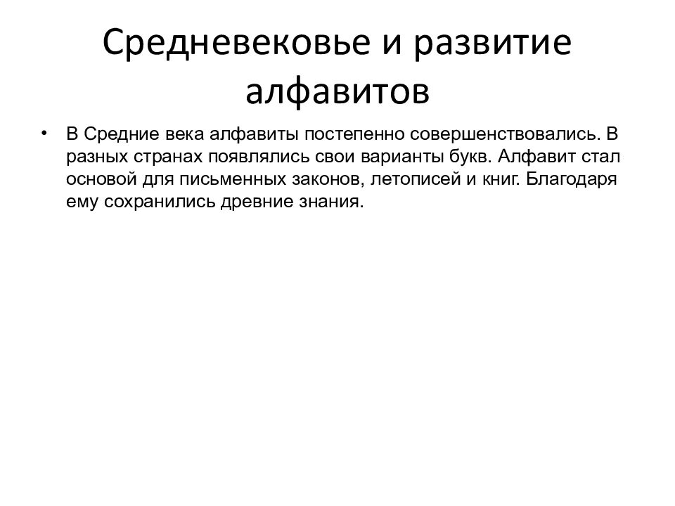 В Средние века алфавиты постепенно совершенствовались. В разных странах появлялись свои варианты букв. Алфавит стал основой для письменных законов, летописей и книг. Благодаря ему сохранились древние знания.