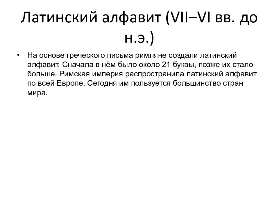 На основе греческого письма римляне создали латинский алфавит. Сначала в нём было около 21 буквы, позже их стало больше. Римская империя распространила латинский алфавит по всей Европе. Сегодня им пользуется большинство стран мира.