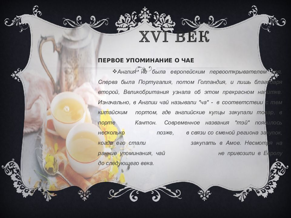 ПЕРВОЕ УПОМИНАНИЕ О ЧАЕ Англия не была европейским первооткрывателем чая. Сперва была Португалия, потом Голландия, и лишь благодаря второй, Великобритания узнала об этом прекрасном напитке. Изначально, в Англии чай называли " ча " - в соответствии с тем китайским портом, где английские купцы закупали товар, в порте Кантон. Современное названия " тэй " появилось несколько позже, в связи со сменой региона закупок, когда его стали закупать в Амое. Несмотря на ранние упоминания, чай не привозили в Европу до следующего века.