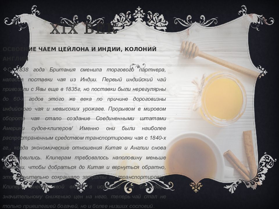 ОСВОЕНИЕ ЧАЕМ ЦЕЙЛОНА И ИНДИИ, КОЛОНИЙ АНГЛИИ С 1838 года Британия сменила торгового партнера, наладив поставки чая из Индии. Первый индийский чай привозили с Явы еще в 1835г, но поставки были нерегулярны до 60-х годов этого же века по причине дороговизны индийского чая и невысоких урожаев. Прорывом в мировом обороте чая стало создание Соединенными штатами Америки судов-клиперов / Именно они были наиболее распространенным средством транспортировки чая с 1840-х гг., когда экономические отношения Китая и Англии снова возобновились. Клиперам требовалось наполовину меньше времени, чтобы добраться до Китая и вернуться обратно, это значительно сокращало затраты на транспортировку. Клиперы внесли свой вклад в историю чая благодаря значительному снижению цен на него, теперь чай стал не только привилегией богачей, но и более низших сословий.